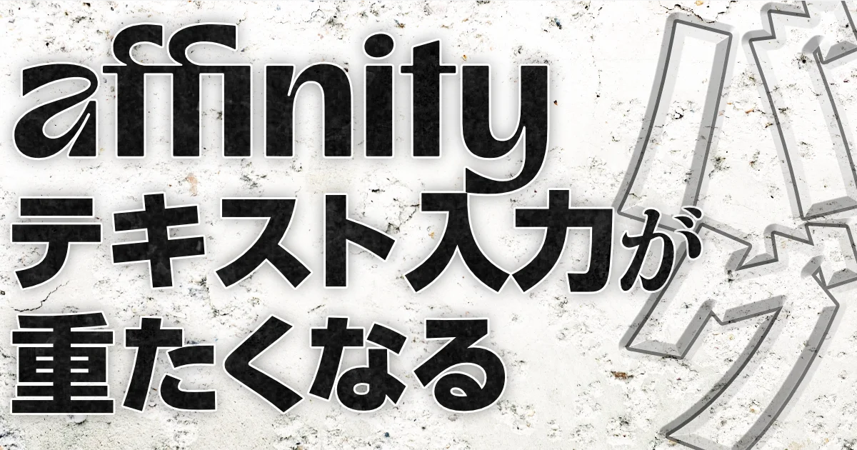 Affinity ではパネルの表示状況によりテキスト入力時に遅延が発生します。解決方法はズバリ「開いているパネルを少なくする」「Tabキーを押下して全画面モード状態とする」が挙げられます。要するに、重たくなる原因であるパネルを見えなくすると、テキスト入力のラグは解消され、重たくなくなります。