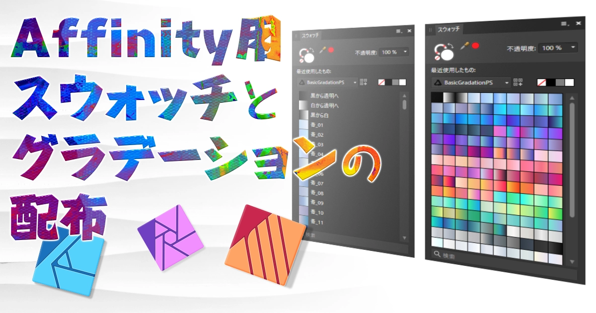 Affinity Designer, Photo, Publisher の拡張グラデーションを配布します。Affinityシリーズに搭載されているデフォルトのグラデーションは数が少なく貧弱です。それを補うためのグラデーションファイル1つと、13種類のスウォッチファイルをダウンロードできます。