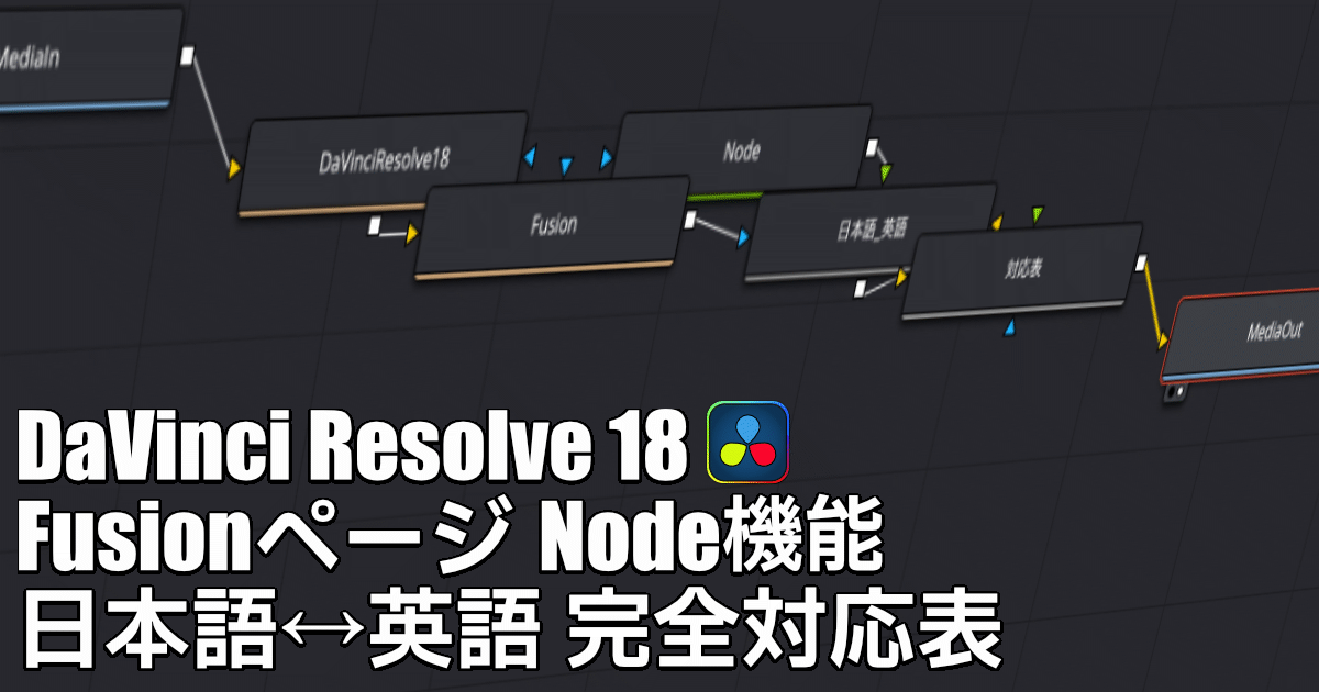 DaVinci Resolve 18 Fusionページの日英対応表です。ページ内検索でノード機能を検索してください。英語版のチュートリアルを見る時にも役立ちます。